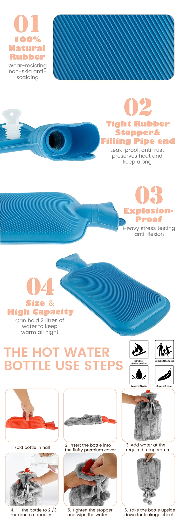 Need suured 2-liitrised veepudelid on ideaalne viis aastaringselt soojas püsimiseks. Need sobivad suurepäraselt diivanil või voodis kaisutamiseks pärast kirglikku päeva või koduseks termoteraapiaks, et leevendada valusid keha ümber.